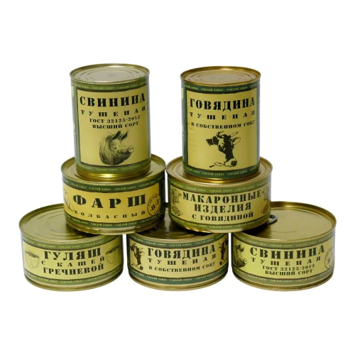 Состав тушенки: говядина, жир говяжий, лук, соль пищевая поваренная, перец черный молотый, лист лавровый сухой.