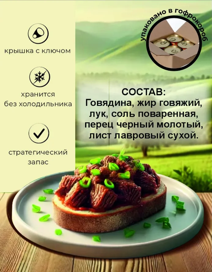 Состав: Говядина мякоть; соль поваренная; лук репчатый; перец черный молотый; лавровый лист